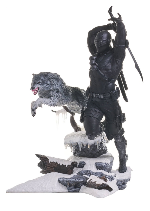 ダイアモンドセレクトの簡易PVCスタチューシリーズ「ギャラリー」。新作としてラインナップするのは『G.I.Joe A Real American Hero』からスネークアイズです!ハズブロのフィギュアシリーズから、1980年代にはアニメ作品『地上最強のエキスパートチーム G.I.ジョー』、2009年には実写映画化もされた『G.I.ジョー』シリーズで欠かすことの出来ないキャラ「スネークアイズ」。相棒の狼「ティンバー」を伴い、敵めがけてブレードを振りかぶった姿を全高約28センチにて再現しました。このシリーズの注目ポイントの一つであるベースのジオラマ演出は、雪化粧の岩場をフィーチャー!