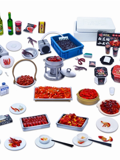 世界のどこか、具体的にいえば中国で交わされてる会話。中国で夏の風物詩となっているらしいです、ザリガニ料理。日本ではなじみのないこのザリガニ料理、1/12スケールでミニチュアモデル化したところがあるようです。香辛料とともにビールで流し込む、そんなスタイルを再現すべく、ザリガニの料理だけではなく道具などにまで本気出しています。なぜそこで本気出したし。「全部集めてザリガニパーティーを開きましょう」がメーカー談。ラインナップはノーマル10種にシークレット1種。シークレットのザリガニってもはや神話級では。※ボックスで購入されても全ての種類が揃う保証はございません。