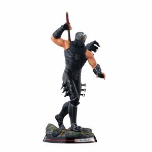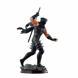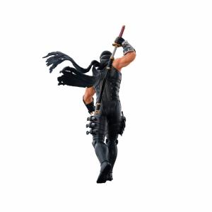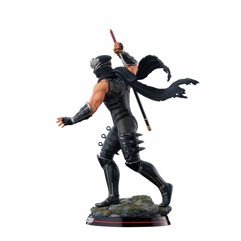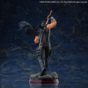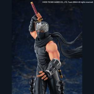 コーエーテクモゲームスのハイスピード忍者アクションゲーム『NINJA GAIDEN』シリーズ。1988年の『忍者龍剣伝』からこのシリーズの「顔」として主役を務めてきた龍の忍者「リュウ・ハヤブサ」が、海洋堂の手により、迫力の1/7スケールフィギュアとしてリリース!シリーズ三作品をパッケージした『NINJA GAIDEN マスターコレクション』のメインビジュアルをイメージし、背中の鞘から龍剣を抜き放ちながら、待ち受ける闘いへと歩みを進める決意に満ちた姿をセレクト。鋼の鉢金の下から鋭い視線を送るシリアスな風貌に、肌を露わにした両腕の隆々と盛り上がった筋肉をリアルタッチに造形。近未来的な忍者スーツは同じ漆黒でもパーツごとに異なる素材の質感を、ディテールと塗装で精細に表現しました。アーマー部分に施された剥げ塗装も、くぐり抜けてきた熾烈な戦いを彷彿とさせます。足元のベースには、苔むした石畳と木の葉で和風の世界観を表現しました。